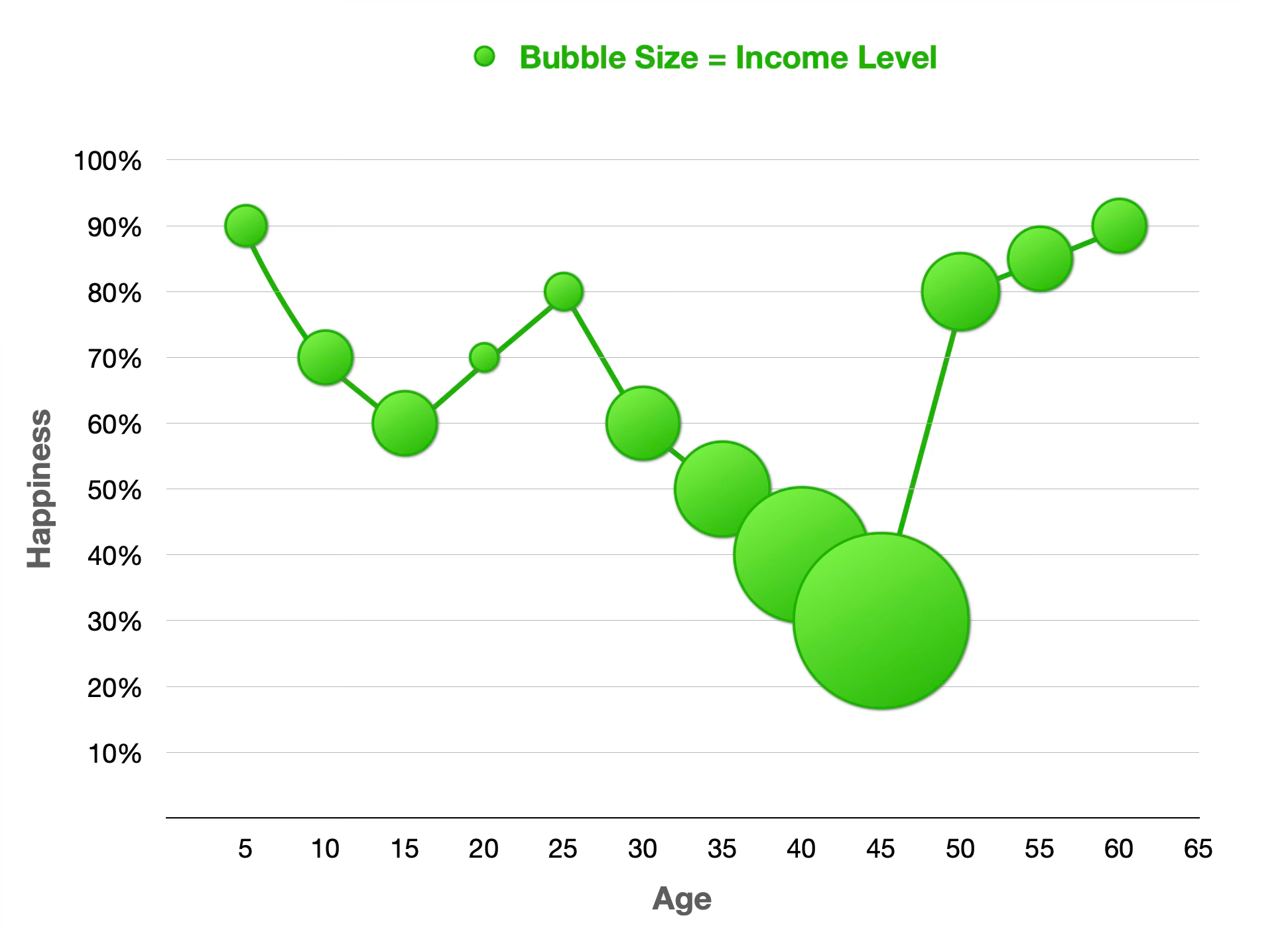 I’m a nerd, and I love creating spreadsheets, charts, and graphics. So, I decided to look back on my life and think about my level of happiness at various points. I also captured data about my income levels at those ages. Believe it or not, I still have many of my paystubs from the 80s and 90s. Probably okay to shred those now…